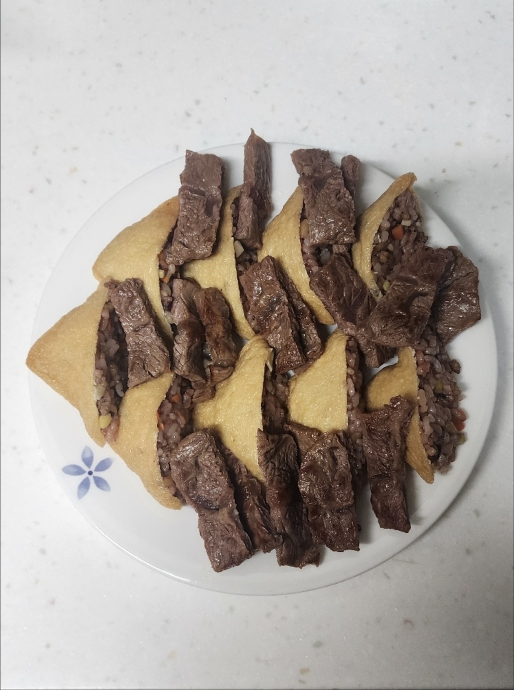 접시에 유부초밥과 소고기를 같이 담아주면 요리 끝입니다.