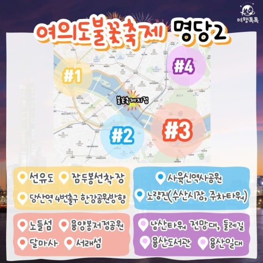 • 원효대교 남단 : 여의도 다음으로 가까운 곳으로, 불꽃이 정면에 잘 보이는 뷰
