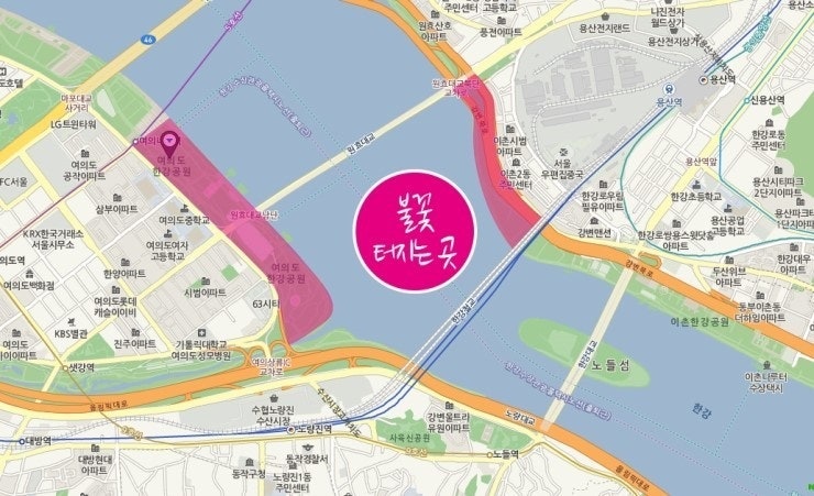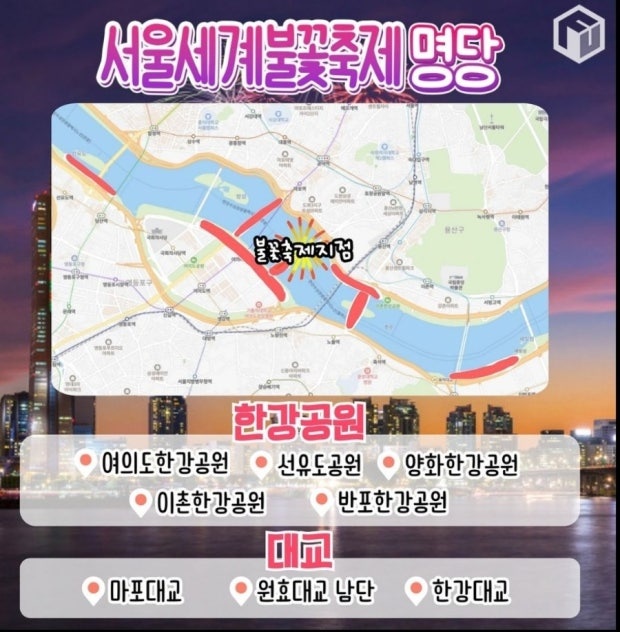 • 원효대교 남단 : 여의도 다음으로 가까운 곳으로, 불꽃이 정면에 잘 보이는 뷰