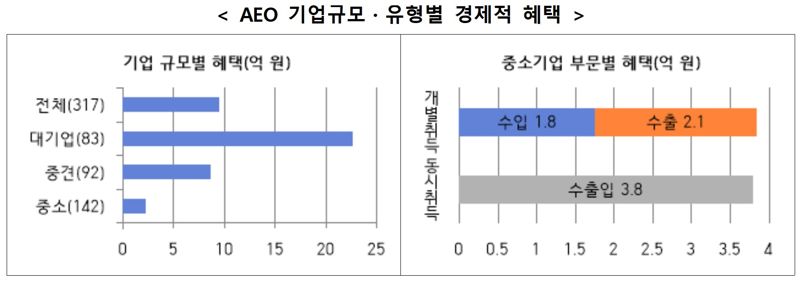 분석 결과, 317개 AEO 기업이 받은 2024년 총 경제적 혜택은 2,992억 원, 기업당 평균 9억 4천만 원으로 나타났습니다.